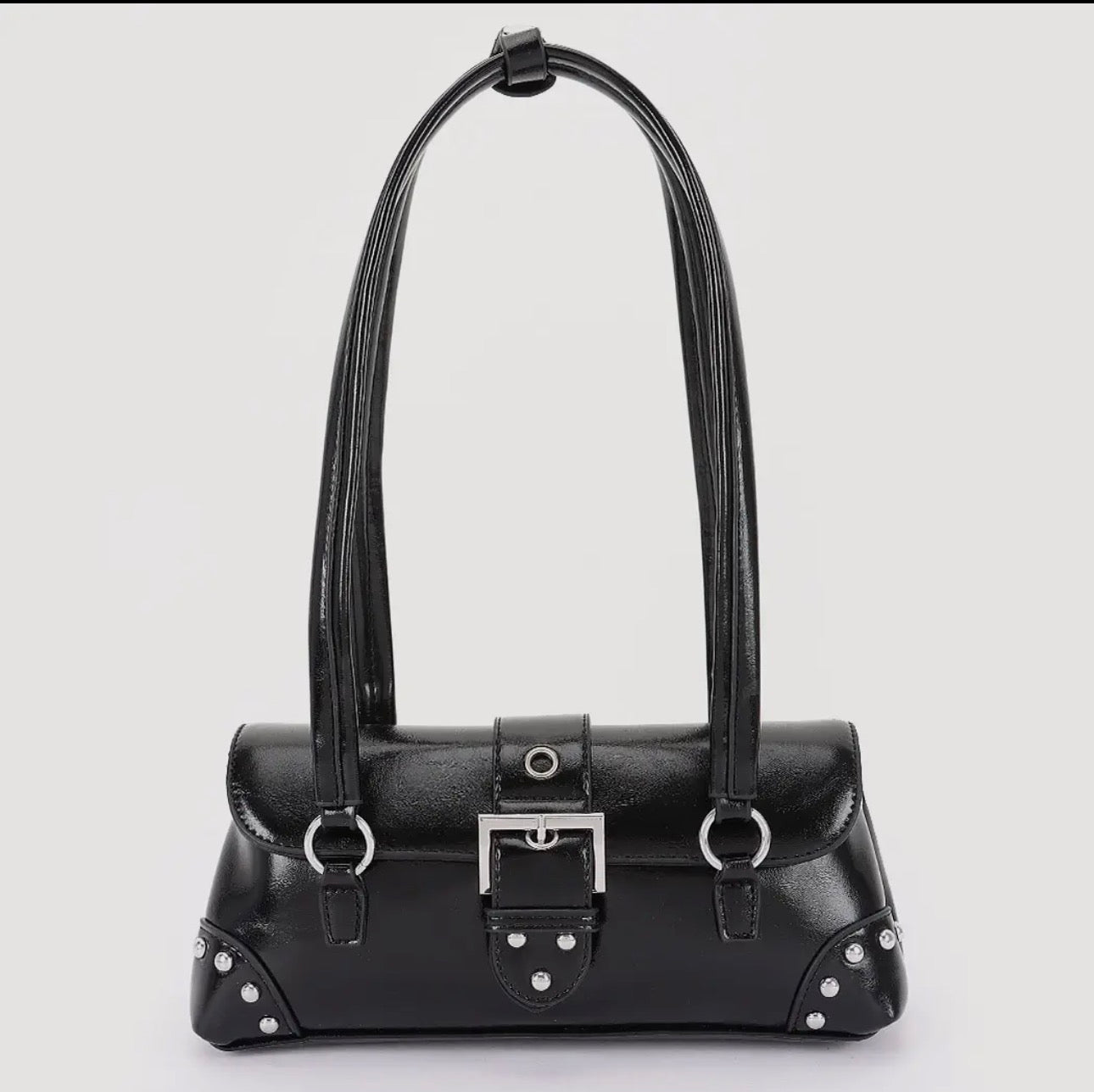 This edgy black vegan leather handbag features metal studs and a prominent buckle detail. Has a retro-inspired design. Add a special touch to your favorite denim outfit, leather jackets or casual wear!